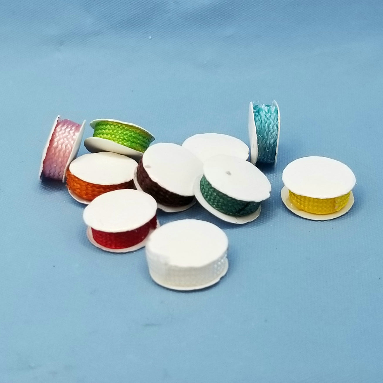 Ribbons of various colours - set of 10. Add to a sewing room or store. 1/12 scale miniature for your dollhouse or diorama.