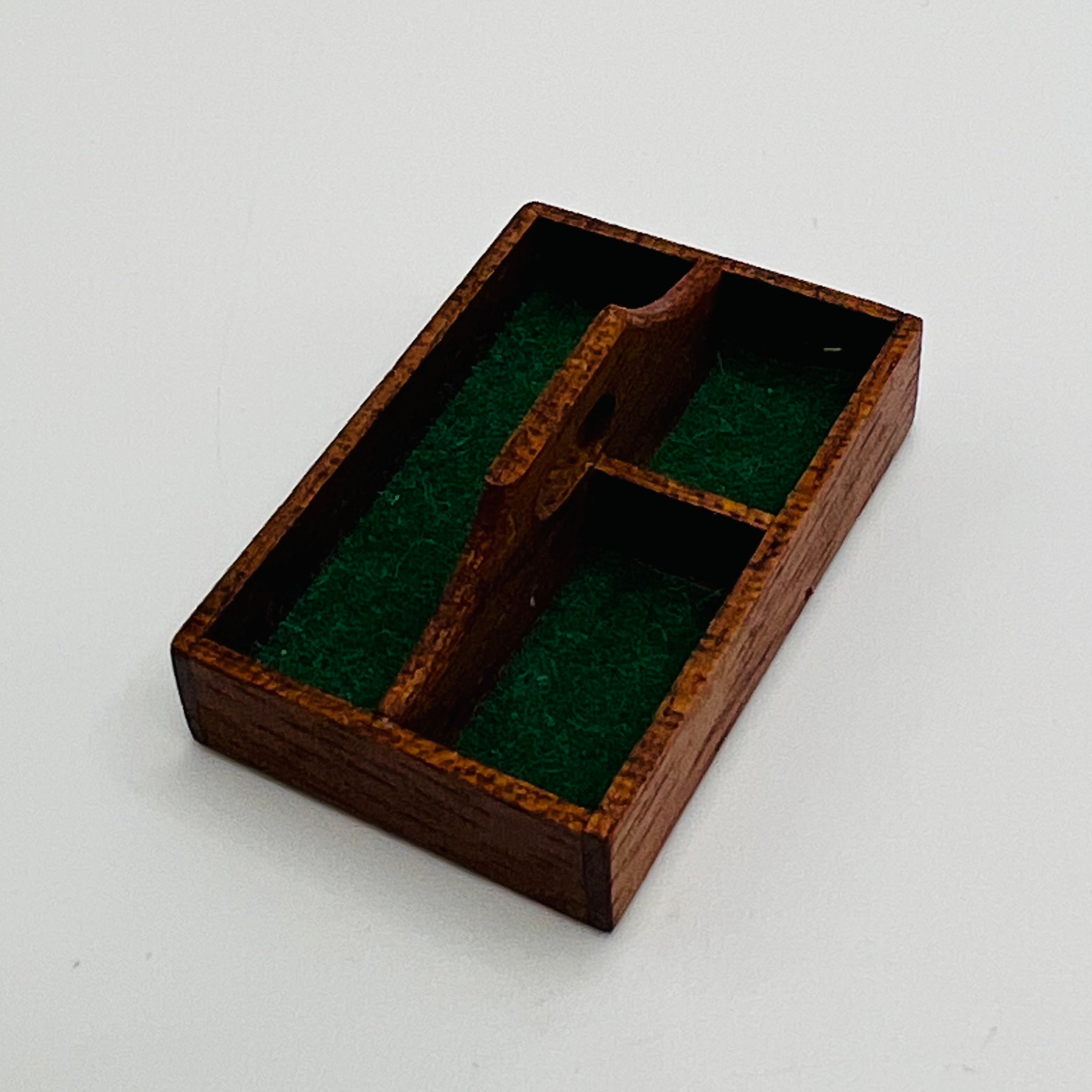 Small exquisite wooden tray with green felt details. Will find a spot in any of your decor. 1/12 scale dollhouse miniature. 1 3/8" long x 7/8" wide x 1/2" high.