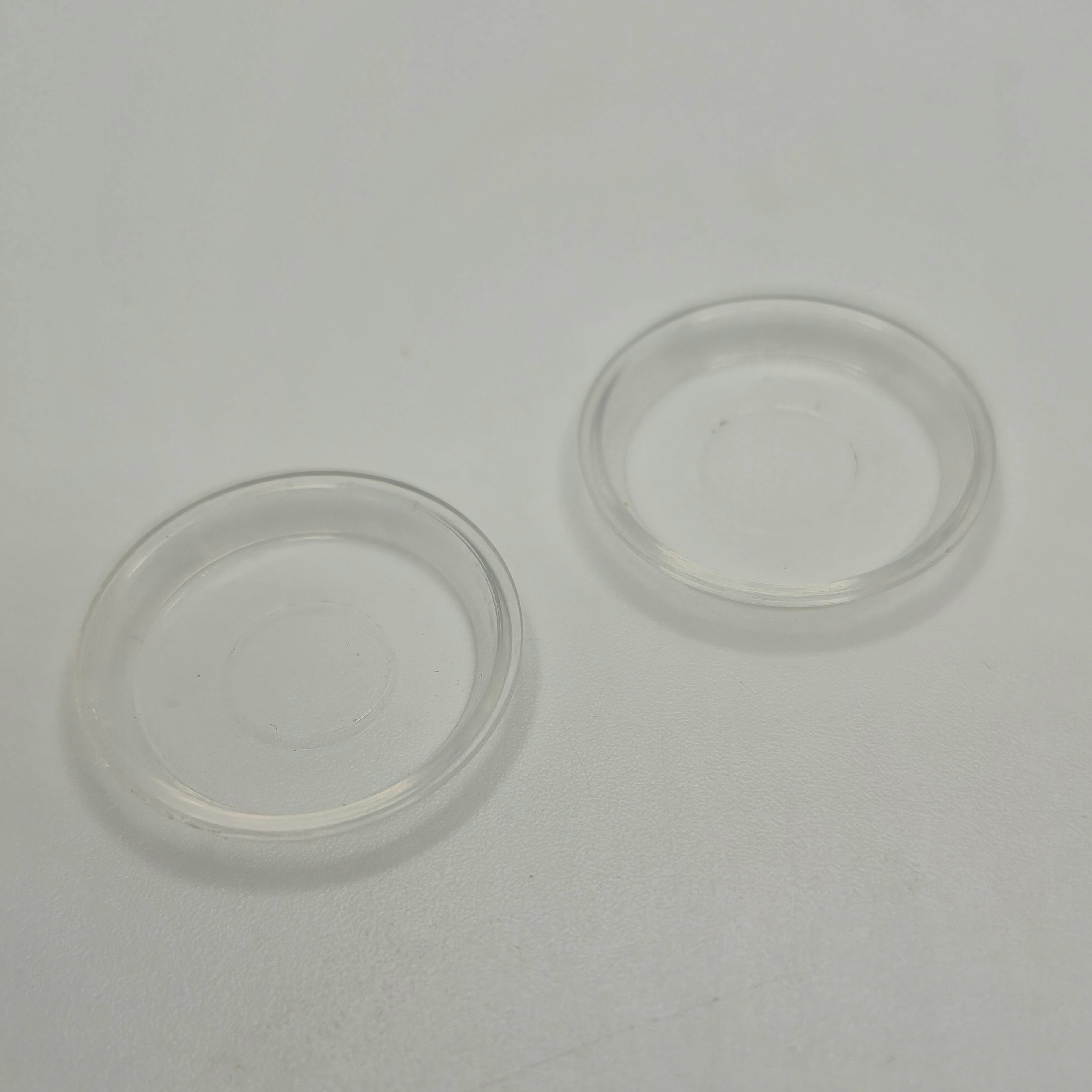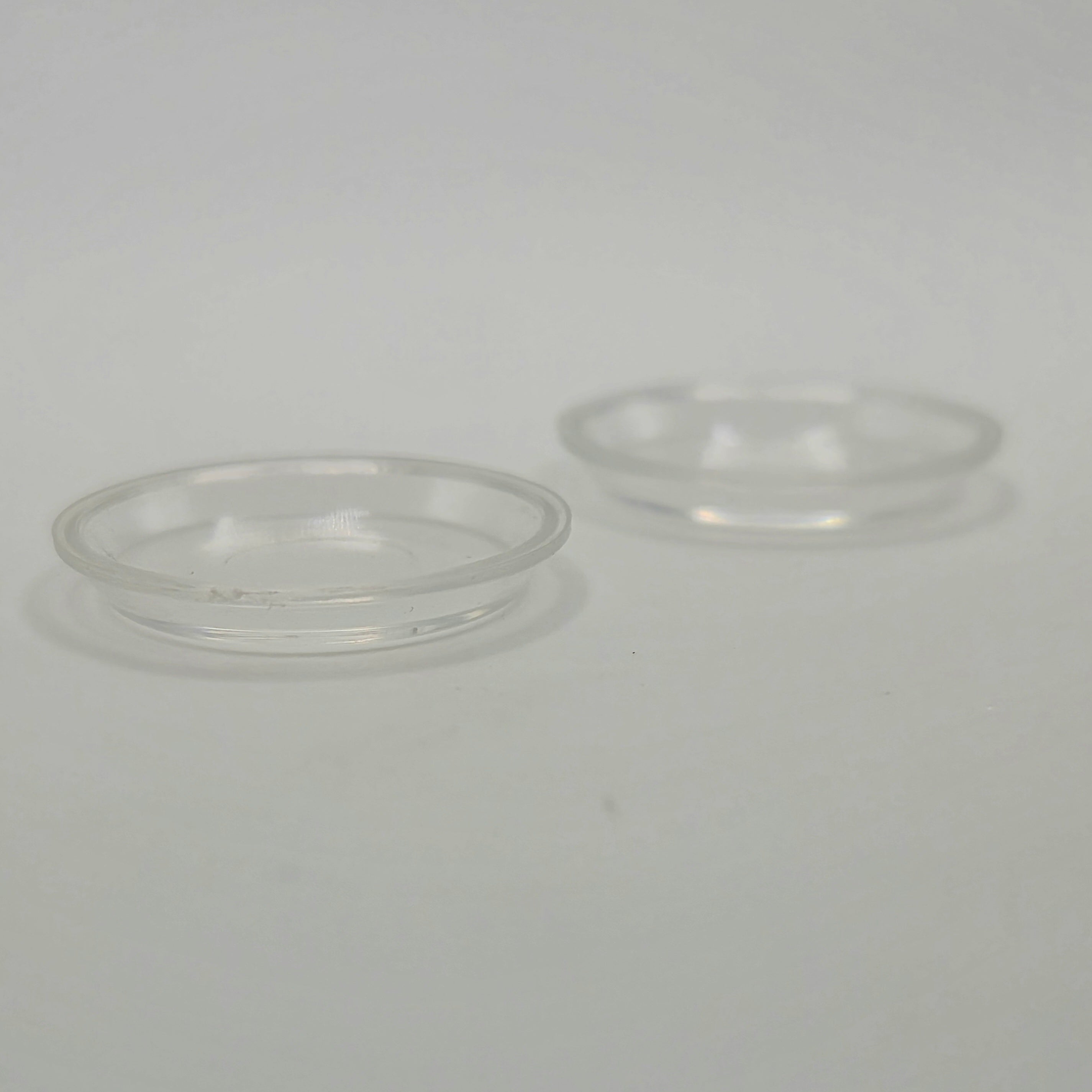 Set of 2 pie plates. Clear plastic. 1/12 scale miniature for your dollhouse or diorama. 13/16" diameter.