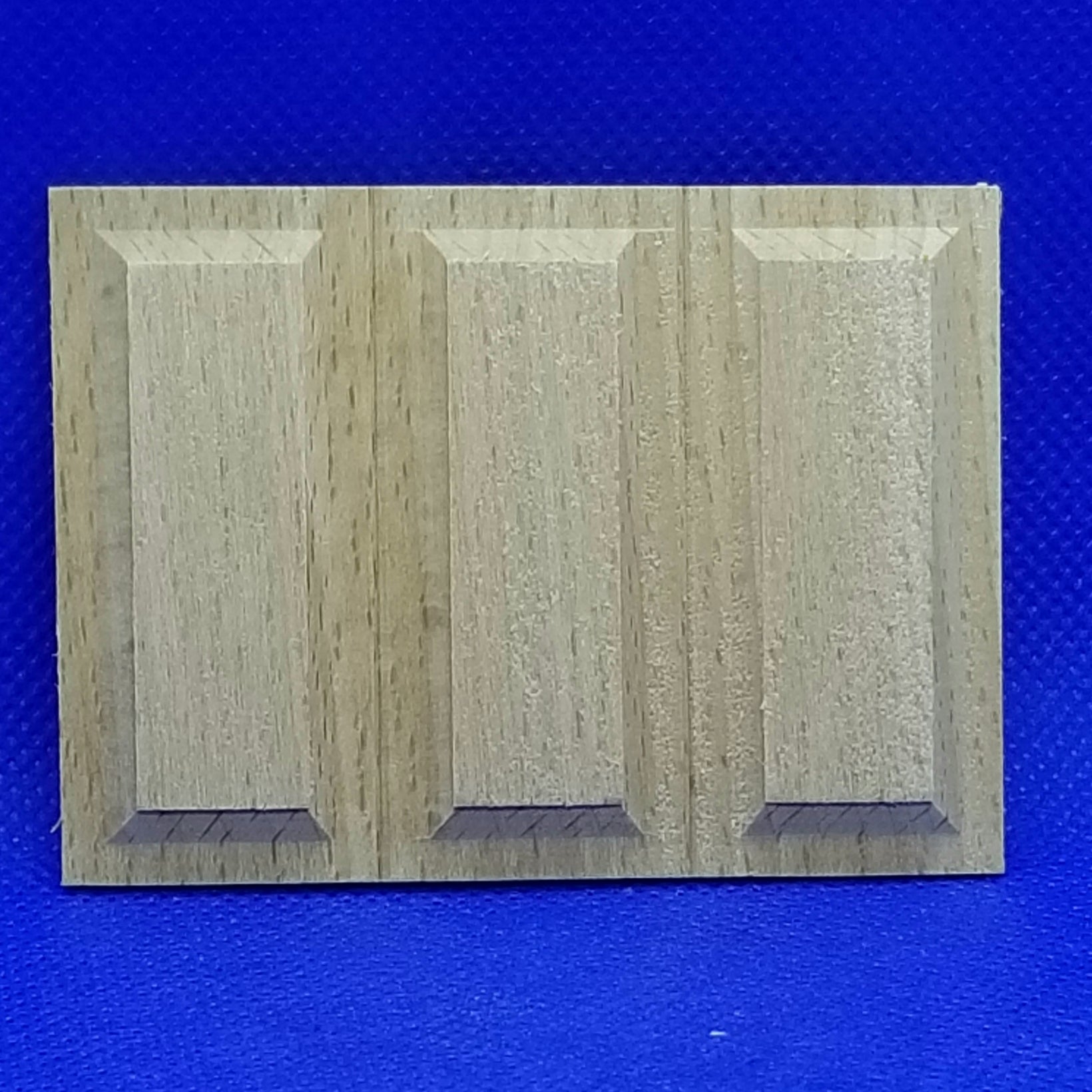 Each miniature wainscot panel or sheet has three raised panels. Unfinished wood, 1/12 scale and 3" wide x 2 1/8" long x 1/8" thick.